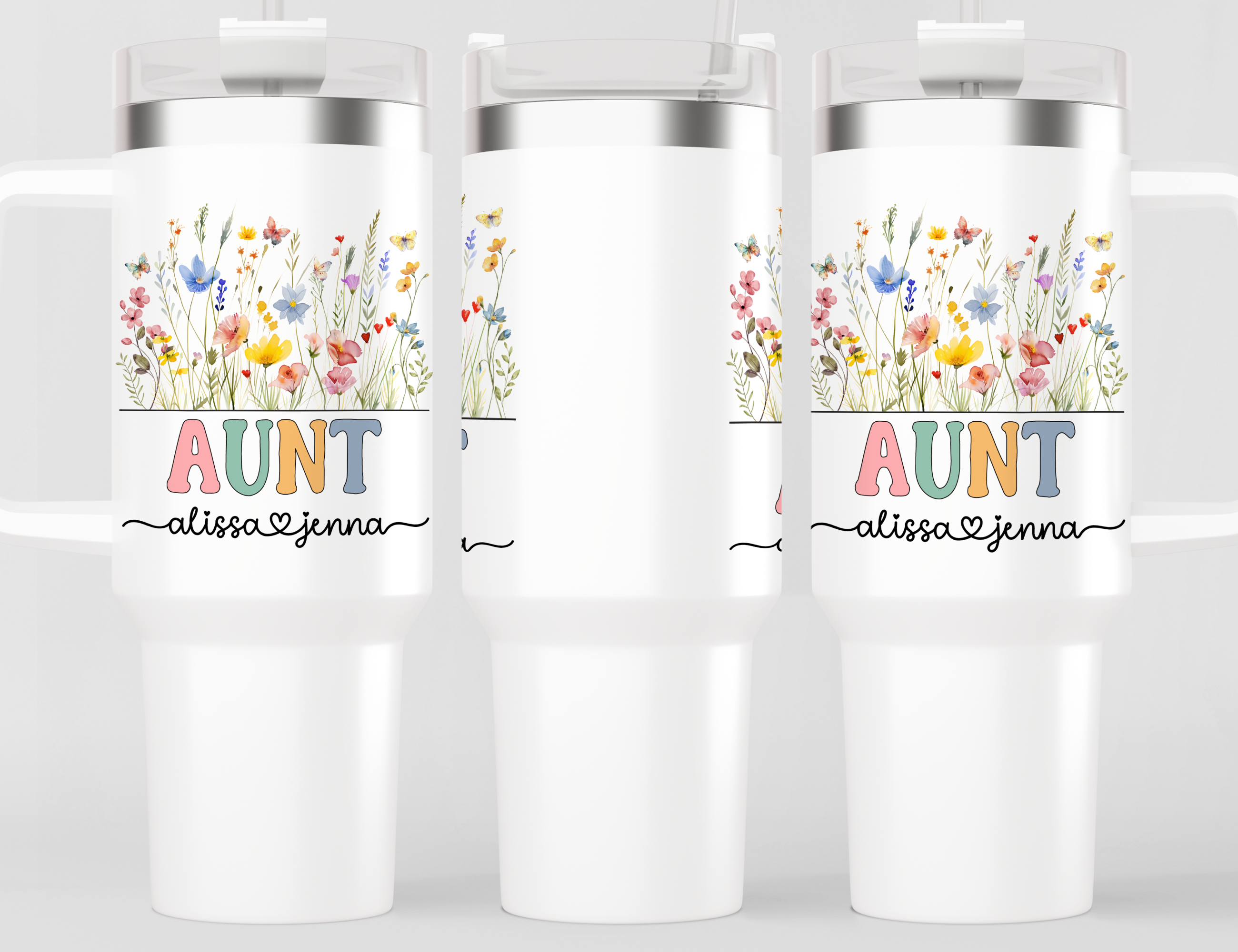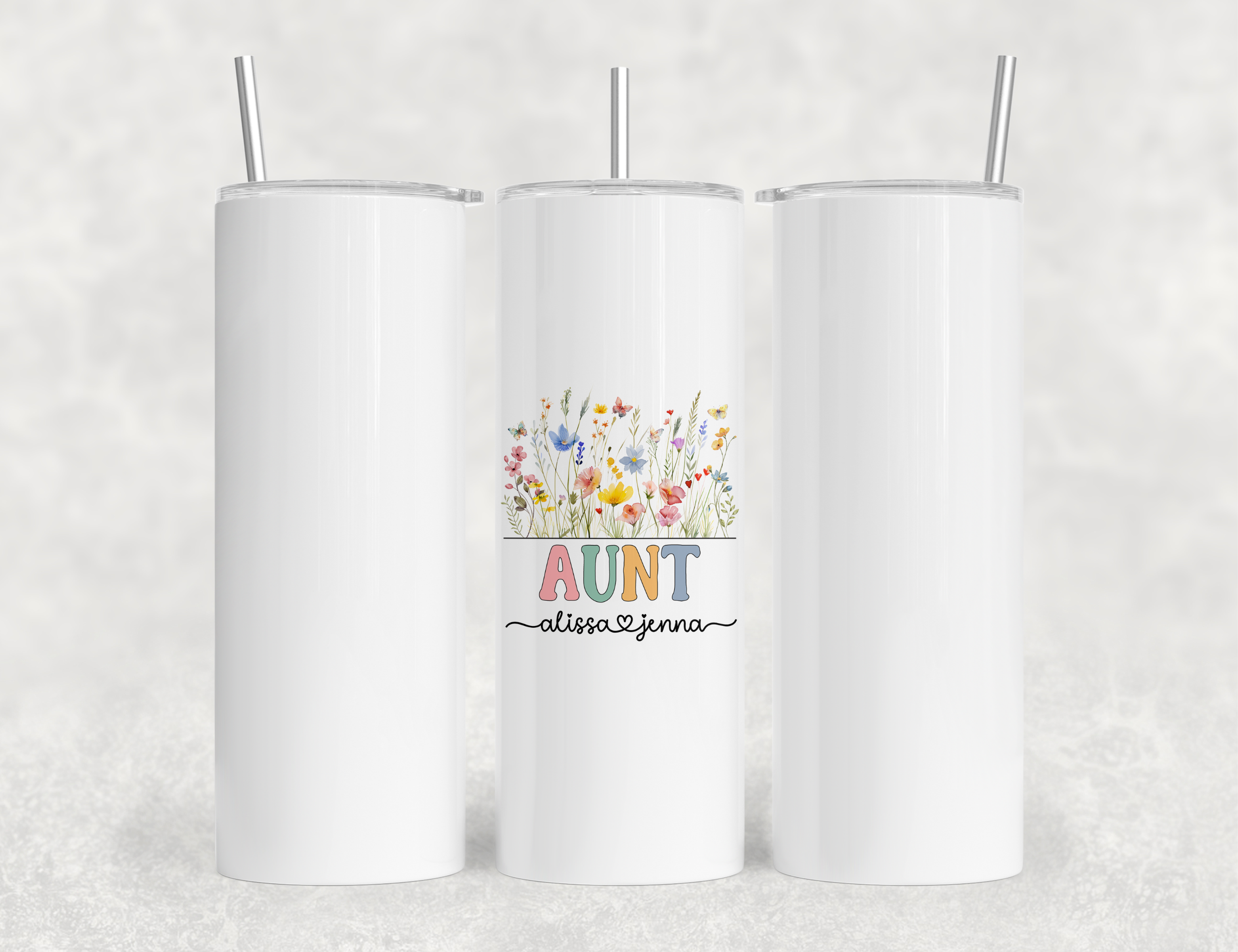 Treat your wonderful Aunt to a personalized tumbler that she will cherish forever. Featuring a delicate wildflower design and personalized with the word "Aunt" and your children's names, this tumbler is the perfect way to express your appreciation. Whether for her birthday, Mother's Day, or just to show you care, this custom tumbler is both practical and heartfelt.