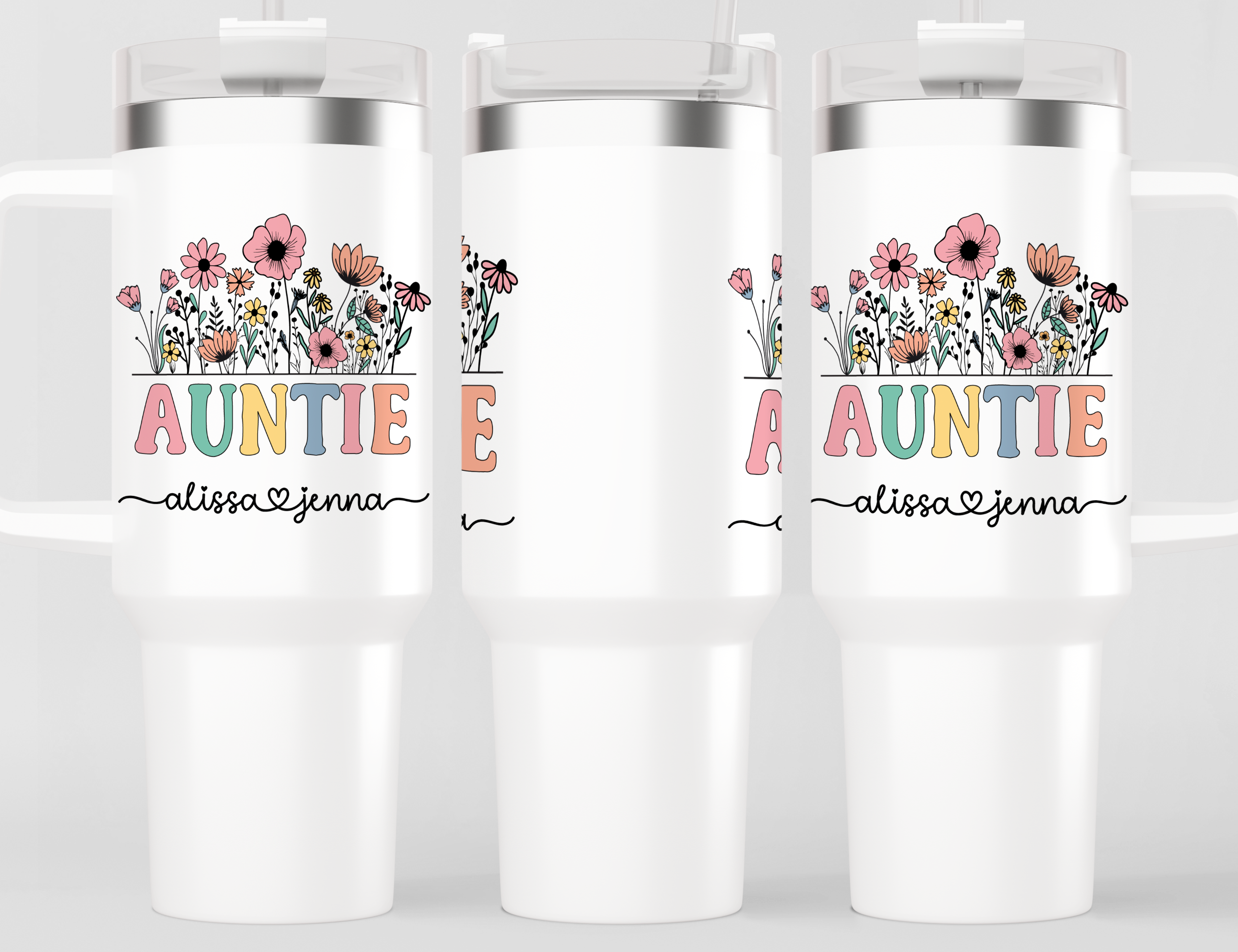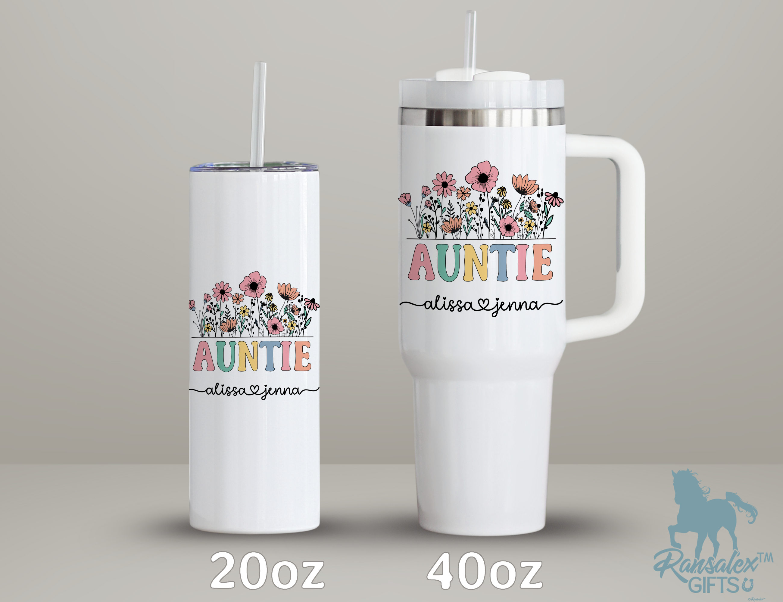 Treat your wonderful Auntie to a personalized tumbler that she will cherish forever. Featuring a delicate wildflower design and personalized with the word "Auntie" and your children's names, this tumbler is the perfect way to express your appreciation. Whether for her birthday, Mother's Day, or just to show you care, this custom tumbler is both practical and heartfelt.
