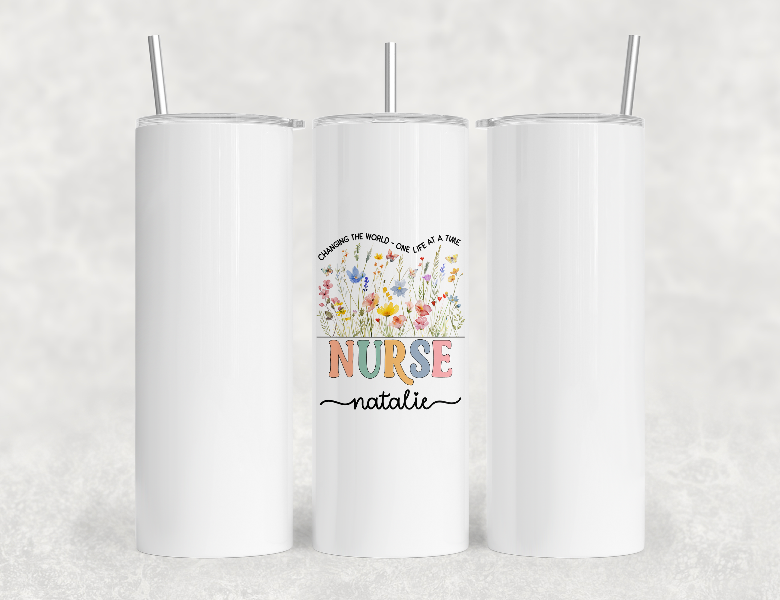 Honor your favorite nurse with this meaningful, personalized tumbler showcasing beautiful wildflowers and the inspirational quote, "Changing The World - One Life At A Time." Featuring the word "Nurse" followed by the nurse's custom name, this tumbler makes a heartfelt, practical gift perfect for Nurse Appreciation Week, graduations, birthdays, or to show everyday gratitude.